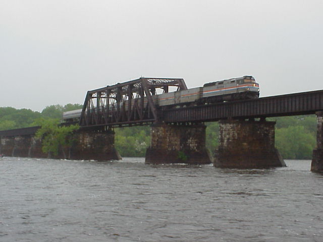 Lacking anything else to do, we chased it south, catching it again on the siding at Hayden. (Photo) We continued south to the Farmington Bridge at Windsor, where we first saw the northbound Amtrak Vermonter, (Photo) running in push mode, followed by the southbound CSO train. (Photo)