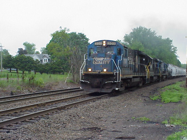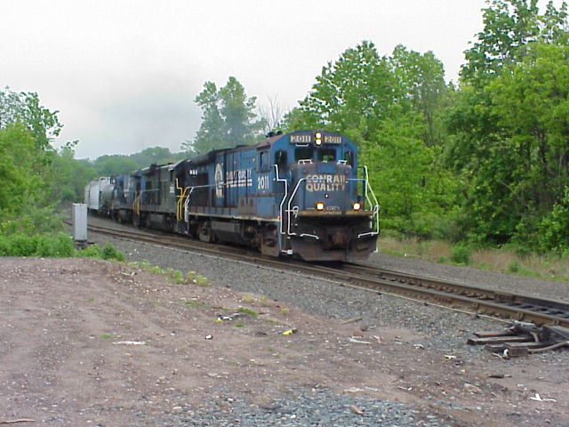 From there, we drove a little ways east and checked out a local trolley museum, and then returned to Windsor Locks. After a northbound Amtrak train went past the old Windsor Locks station, we were surprised by the arrival of a Connecticut Southern (CSO) southbound train. (Photo) CSO's motive power fleet consists of ex-Conrail B23-7s, still in Conrail paint. The exception was the middle unit on this train, an ex-Norfolk Southern high-hood B23-7, still wearing NS black and lettered for sister railroad Indiana Southern.