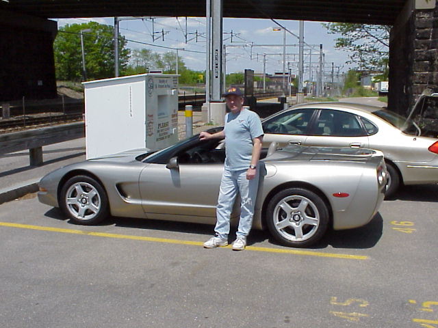 Back I went up to Readville station to see my friend Ed St. George, a policeman, railfan, and all-around good guy. He runs the website Mainlines East and has quite a unique railfan vehicle--a 1999 gray ragtop Corvette. (Photo--that's my rental car behind it) Last time I was there, Ed was driving his 1994 blue Corvette coupe. I defintely like his new one better!