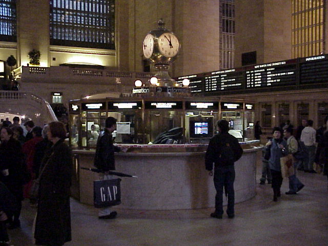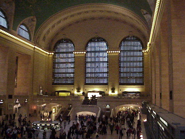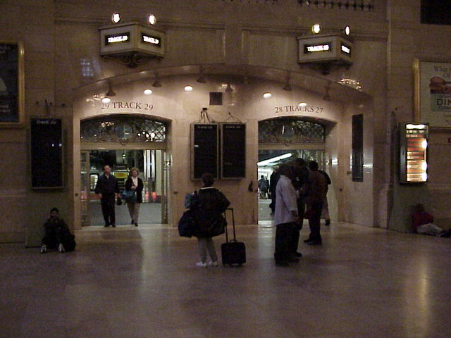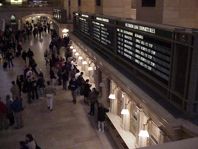 Arriving at Grand Central, we first took a look at the New York City Transit Museum located in the Terminal, which had a display of O. Winston Link's photography. Link was a genius when it came to night pictures, and his work on the Norfolk & Western steam trains is legendary. After that we looked around the station, including the main waiting room (Photo), the ticket windows and departure boards (Photo), and the famous gold clock and information desk in the center of the main waiting room (Photo). We looked around also at some of the different tracks (Photo), where trains were lined up ready to depart (Photo).