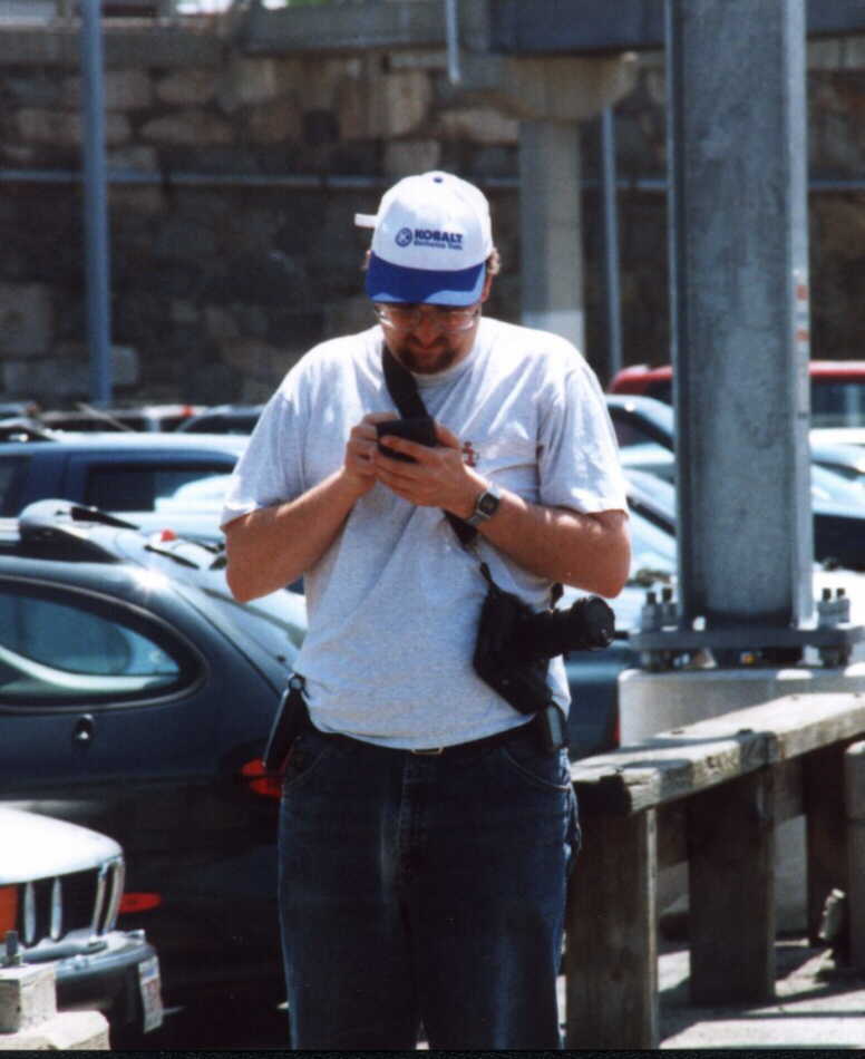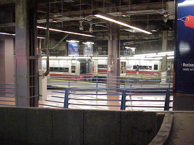 There were a few train movements through the station while we were there. A couple of T trains went up and down the connection to the Franklin Line, and I saw my first Amtrak AEM7 electric under the wires there--being towed dead by a pair of Amtrak switchers. Ed even got into act of some candid photos, such as one of me composing a shot of a T train (Photo) and one of me writing photo notes into my Palm organizer (Photo). (It's the geek railfan at work!)