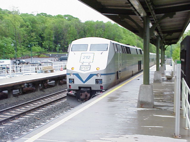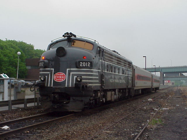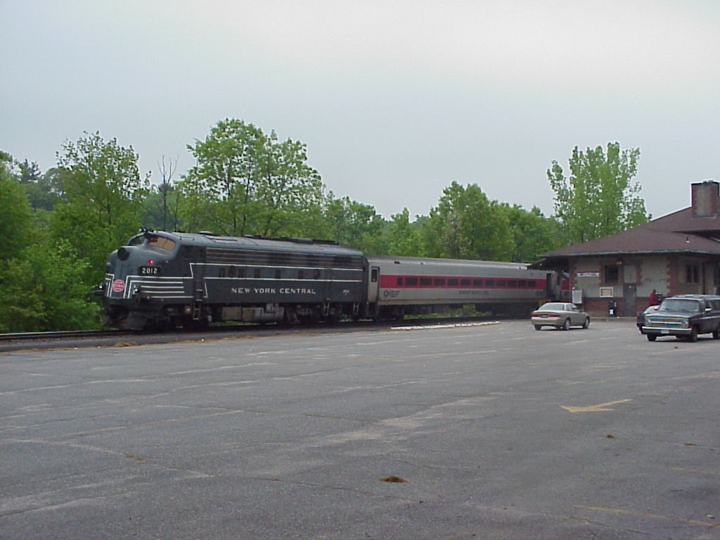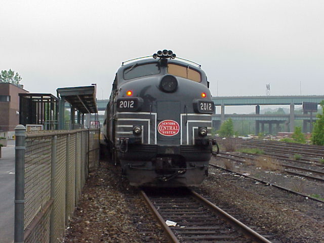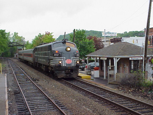 I found out the next morning that I had mostly exhausted my supply of sunlight for the trip, as the next morning dawned dark, cloudy, and wet. I drove over to Waterbury to see what was on the Waterbury Branch shuttle train, and found that it was one of Metro-North Railroad's "New York Central" FL9 locomotives. (The quotes are because NYC never owned any FL9s, but Metro-North painted a pair in NYC colors last year for a special celebration. While they aren't prototypical, they do look nice.) Seeing that the weather stunk, I decided to save my film, so I pulled out my dad's digital camera and took some pictures. (Photo) (Photo) I then drove down to the station at Naugatuck and before the train left and caught it backing in next to the station. (Photo)