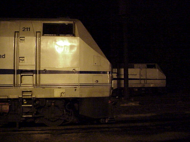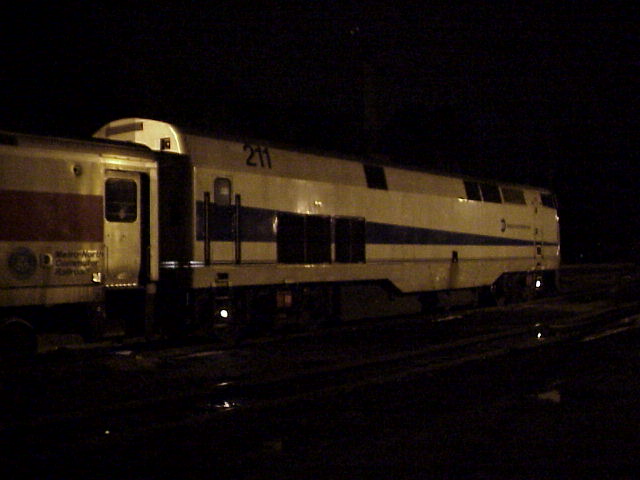 We drove back to Danbury and took some night photos of the Metro-North trains which layover there on the weekends. (If the weather doesn't cooperate, make your own light....) We did a couple shots by the museum (the original station), and after asking for and receiving permission to drive back in by the Metro-North trains, we tried some more shots, both with flash and as time exposures. I even experimented with the digital camera to see how it would do with the available light. (Photo) (Photo) After that, we packed up and drove to Fishkill, New York, for the night.