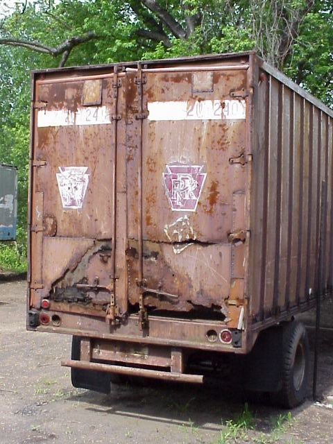 I looked at my Amtrak schedule for the Springfield Line and found that there was a northbound soon leaving Hartford. It would be on the Connecticut River Bridge at Enfield shortly, with perfect light on it, so I drove over there, parked the car, and walked down to the river bank. Unfortunately, there were a lot of puff clouds that morning, and they got me when the train arrived. So I'm 0-for-2 in catching a train on that bridge in good sunlight.... I did see, though, next to where I parked the car, an old trailer with Pennsylvania Railroad keystone emblems still on its doors (Photo).