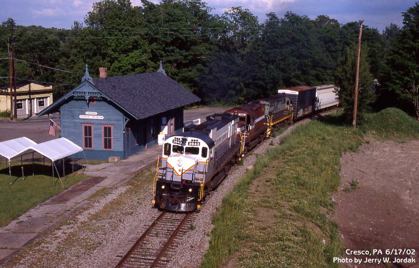Mercury Guy and I beat the train to Moscow and shot him passing the station, which was still boarded up because the 2002 Steamtown excursion season does not begin until July. From there, I drove south to Tobyhanna, forgetting once again that, despite what the map may lead you to believe, there is a stop sign at the intersection of routes 435 and 307, and taking about six months of life off of my brake pads in the process… After arriving safely at Tobyhanna, I had about 45 seconds to get ready for the shot, as the train roared through doing every bit of 40 MPH. At this point, I figured it would be a tough chase the rest of the way. Fortunately, I got through Mt. Pocono fairly easily, and arriving at Gravel Place on the north side of East Stroudsburg, I found that the train hadn't arrived yet. Mercury Guy, John and Mack, and another older gentleman from New Jersey (along with his two dogs) showed up as well to await the train. Apparently he had stopped at Cresco to make a pickup at the lumber transload site.