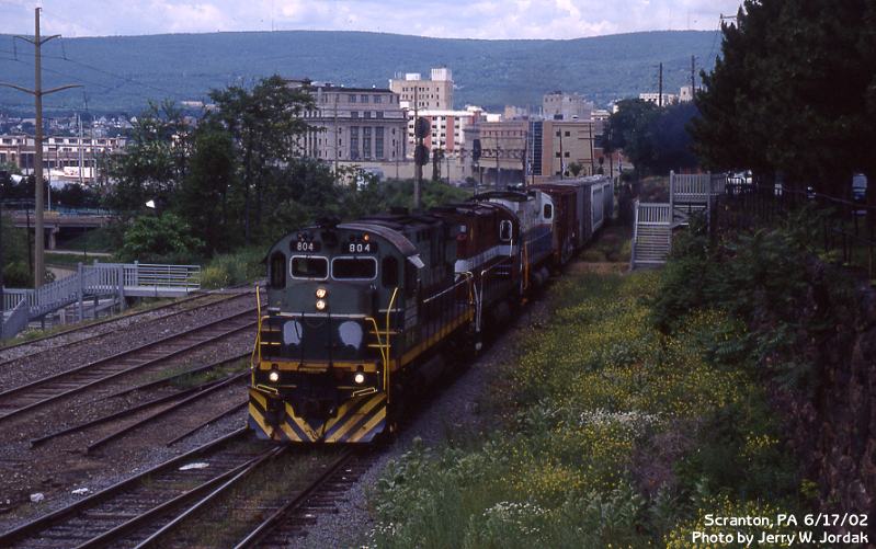 To make a long story short, I was waiting on an overlook along Ridge Row by the University of Scranton with three other photographers around noon, having just photographed a Steamtown shuttle train running with their Nickel Plate painted Geep. Two of them, John and Mack, were from Poughkeepsie, and another guy, whose name I didn't get, but was driving a Mercury Sable, were waiting there as well. At 12:01 PM, train PT-98, the Portland Turn, made its departure from Scranton. Led by the 804, it passed with about 18 cars in its consist. (Photo) I jumped in the car and made chase.