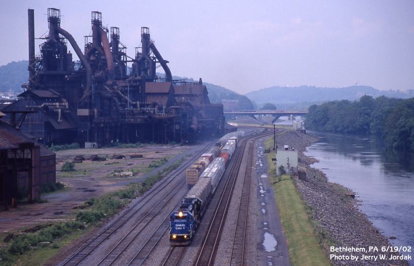 After about a half hour of rain and thunder in the morning, I parked my car and perched on the Hill-to-Hill Bridge above CP-BETHLEHEM. I shot the H65 local (powered by GP38-2 5387 and SD40-2 3435 and both still in Conrail blue) coming out of Allentown Yard across the former Reading bridge over the Lehigh River. From there, I headed down to the Minsi Trail Bridge, and shot the H65 again as it was parked next to the former Bethlehem Steel plant. While on the bridge I met a couple of railfans from New York City, and shot some pictures of the former steel plant. (The bridge has a tall chain link fence all along its length, but there are some "railfan holes" cut in the fence at certain locations. While I'm not one to advocate vandalism of public property, I certain will take advantage of it where present…) After shooting the H74 local going past the plant (Photo), all three of us left the bridge and went our separate ways.