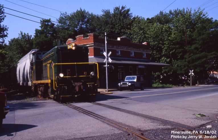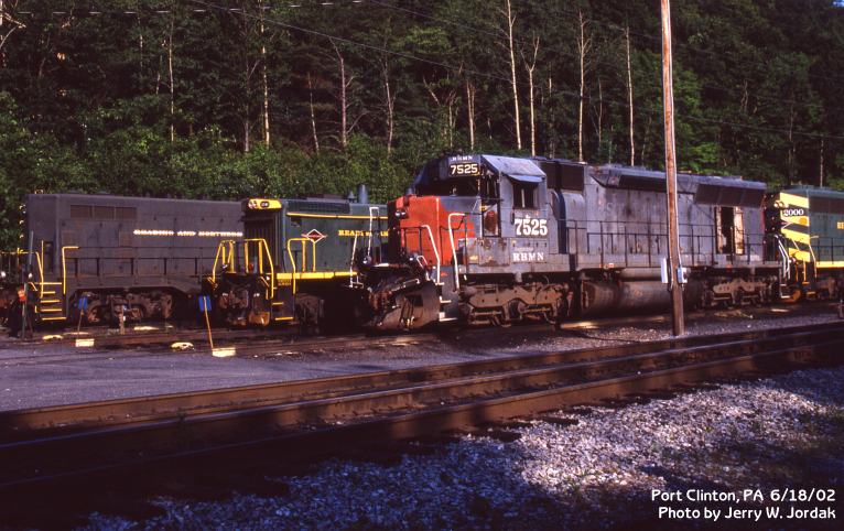 I arose fairly early and after picking up breakfast at Burger King, arrived at Port Clinton, the world headquarters of the Reading & Northern, around 7:30 AM. Just by chance, I happened to run into there another railfan who I had previously communicated with but never met before. We talked with some of the R&N employees to figure out what the game plan was for the day. The Mountain Job, which heads towards Mt. Carmel, went on duty at 6:00 AM and was long gone. The Minersville Job was scheduled to go on duty at 8:00 AM, and take SW8 800 up to work the Reading Anthracite breaker at Minersville along with other local work. Seeing that the 800 was painted in R&N colors, and the Mountain Job probably had one of their ex-UP SD40-2s still in UP paint (which was confirmed later), I decided to chase the Minersville Job. The engineer on that train showed us his paperwork, which didn't have a lot of work to do, but I figured it was worth a chase anyway. We photographed some of the power at the engine terminal, including SP SD45 7525 and SD38 2000. (Photo) The other railfan went home to get some rest, having just gotten off of work, and I watched the Minersville Job take off with the 800 running light (no cars in tow).