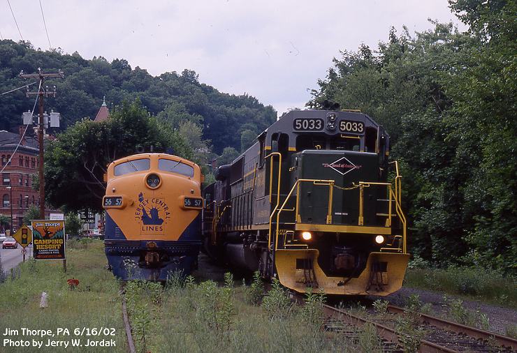 I drove down to Lehighton, where the train was dropping off its cars at the NS interchange, and shot the power coming back north, then shot the power again coming into downtown Jim Thorpe and passing the restored CNJ F-units on display next to the main road. (Photo) After that, I drove back into the old CNJ yard where the power is parked. The Rail Tours passenger train which operates on weekends over the Carbon & Schuykill (former CNJ Nesquehoning Branch) was parked in the yard as well. On a hillside north of town, someone had erected a tall flagpole with a huge American flag, and I took a shot of the 5033 with the flag behind it after the crew had gone home and moved their vehicles from in front of the locomotive.