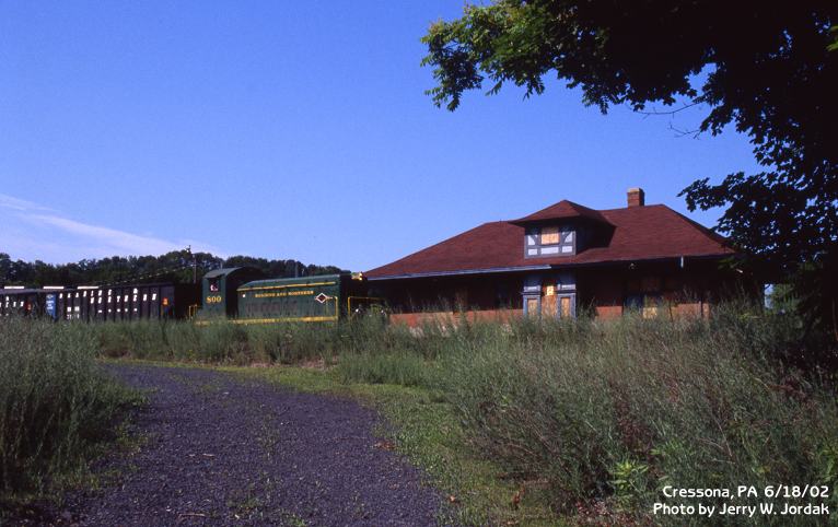 I chased him up to a place south of Landingville, where the tracks cross the Schuykill River on a stone arch bridge. (This spot is just off of Canal Road south of town where the road comes up along the river. There's a place to park your car and a path into the woods that will take you to the riverbank, maybe 50 feet from your car.) I shot the locomotive there, and just missed shooting it again at the Schuykill Haven station, so I went over to West Cressona Yard and watched the crew switch cars. They picked up four empty R&N hoppers for the breaker, then headed north, and I shot the train passing the Cressona station (from safely behind the gate). (Photo)